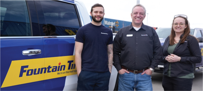 left to right: Evan Morsette | Lead Technician, Fountain Tire Calgary MacLeod, Scott Kessler | Owner Fountain Tire Calgary Northland/Bowness, Deanna Chandler | Assistant Manager, Fountain Tire Calgary Northland, Calgary, Alberta